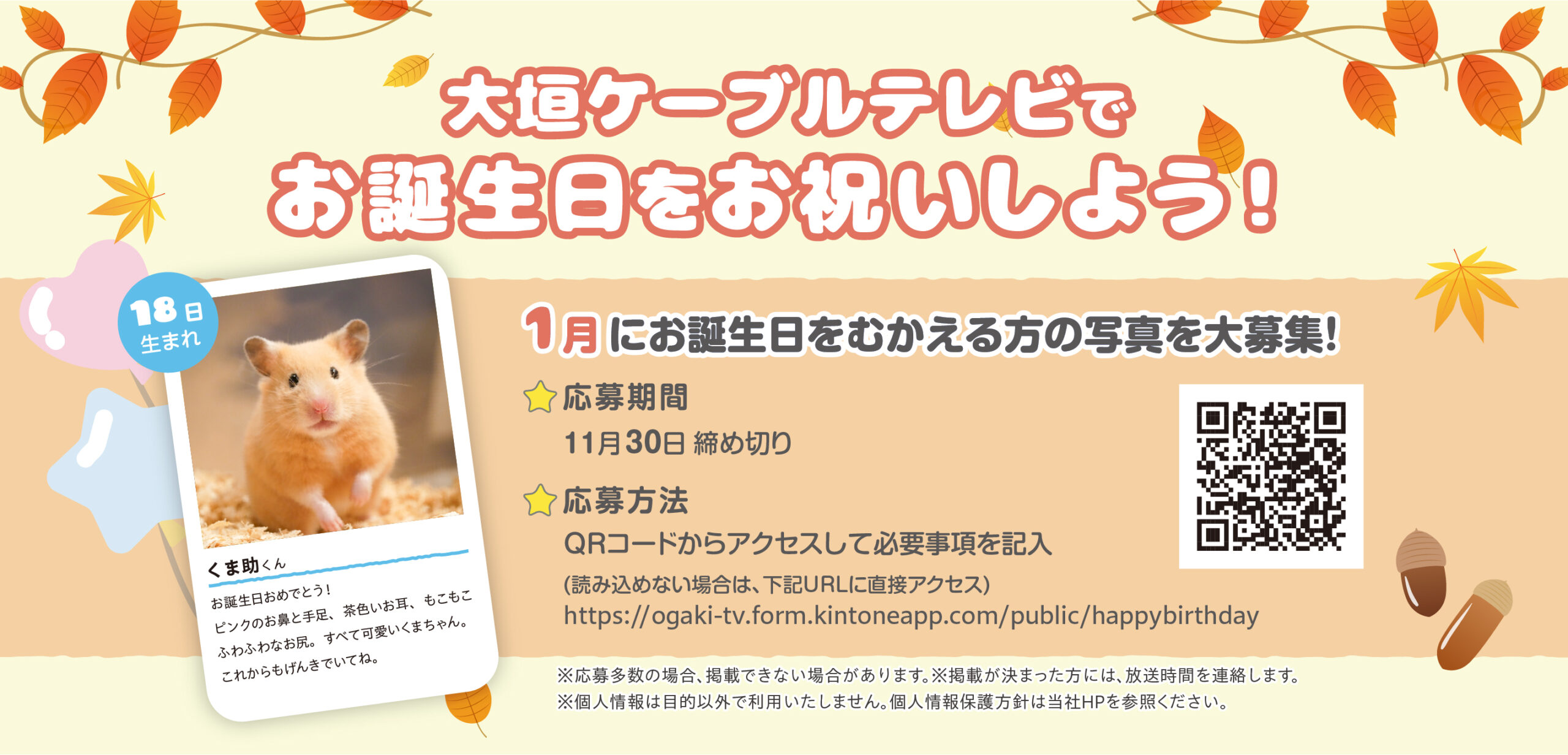 お誕生日を迎える方の写真&お祝いのメッセージを、大垣ケーブルテレビで放送します。